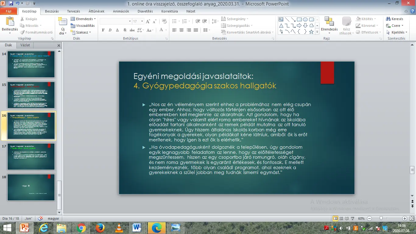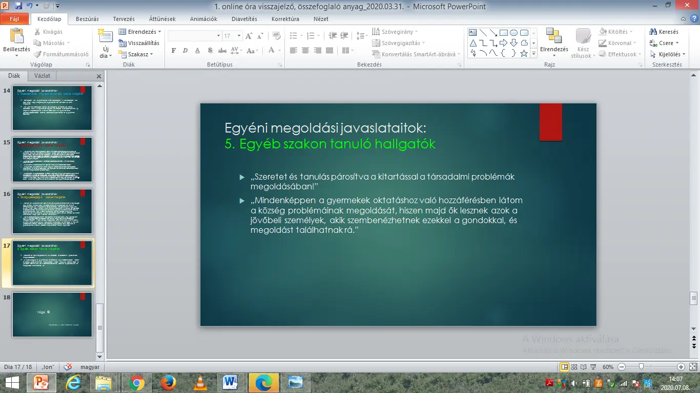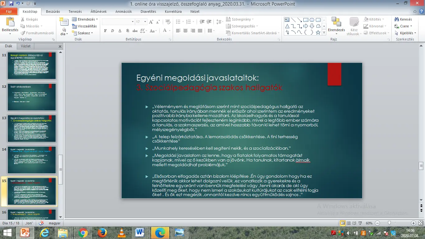Ugyanakkor otthoni feladatul jelöltem ki a hallgatók számára, hogy mindenki, a saját szakterületéhez kapcsolódóan tegyen megoldási javaslatot a filmben bemutatott problémák megoldására vonatkozóan.