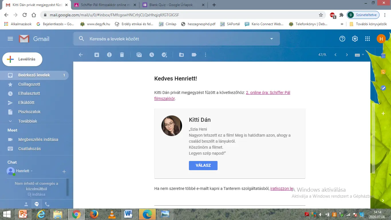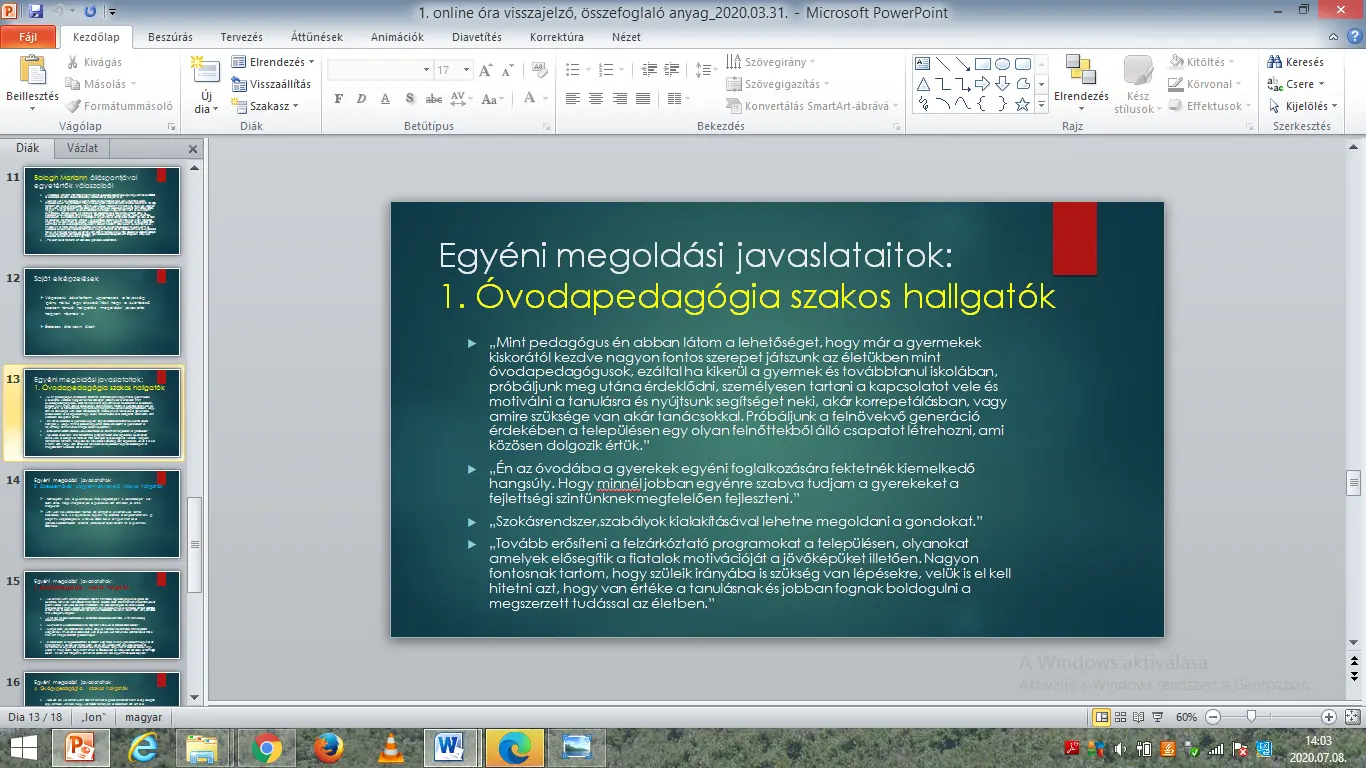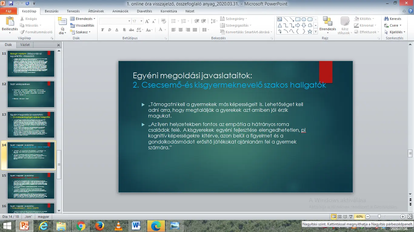 Ugyanakkor otthoni feladatul jelöltem ki a hallgatók számára, hogy mindenki, a saját szakterületéhez kapcsolódóan tegyen megoldási javaslatot a filmben bemutatott problémák megoldására vonatkozóan.