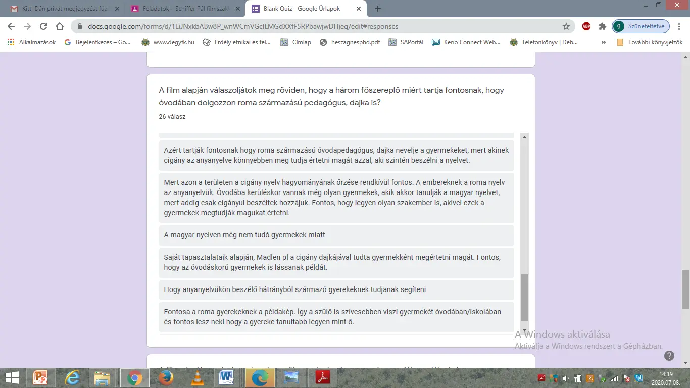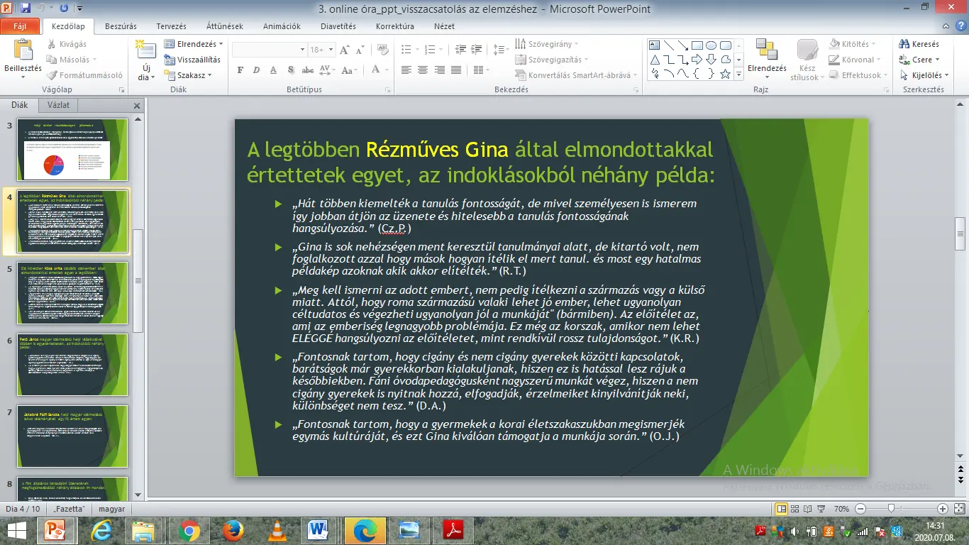 Az elemzés részeként arra kértem a hallgatókat, hogy mondják el a filmben elhangzott vélemények, állásfoglalások közül melyikkel értenek a leginkább egyet és miért. A legtöbben Rézműves Gina (alumni hallgatónk) által elmondottakkal értenek egyet, indoklásuk a következő volt: